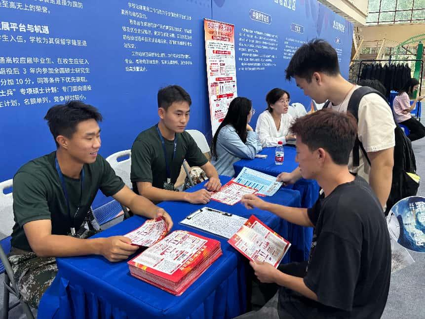 与此同时,俱乐部另外两名成员则驻守在风雨操场,开展政策宣讲工作。他们结合自身军旅经历,详细讲解最新征兵政策、报名流程、优抚待遇等关键信息,用真实故事分享军营生活的成长与收获,为有参军意向的同学答疑解惑,积极引导青年学子将个人理想融入国防事业,点燃同学们的参军热情,为有志投身国防事业的学子搭建起政策沟通的桥梁,传递“携笔从戎、保家卫国”的青春正能量。