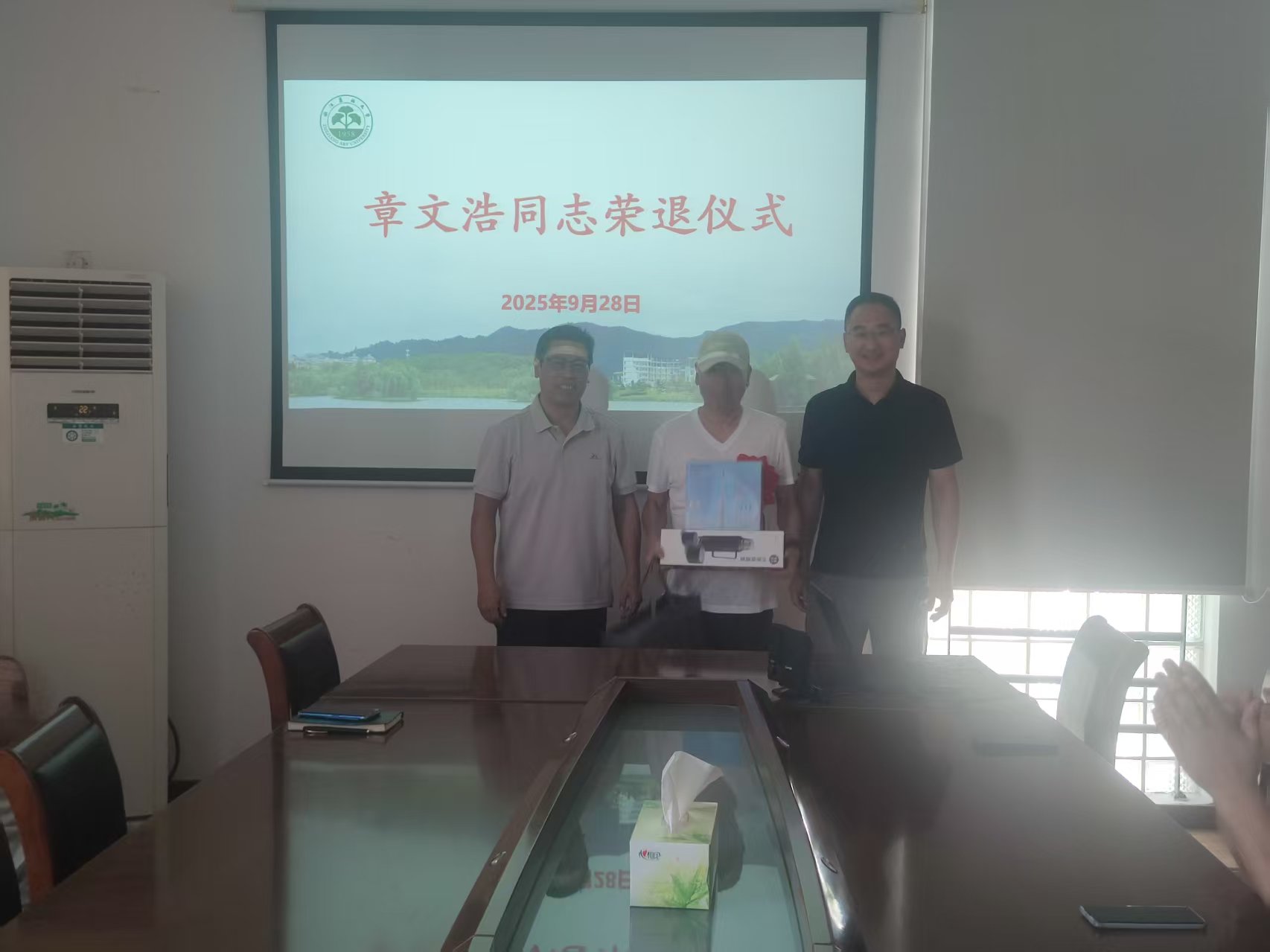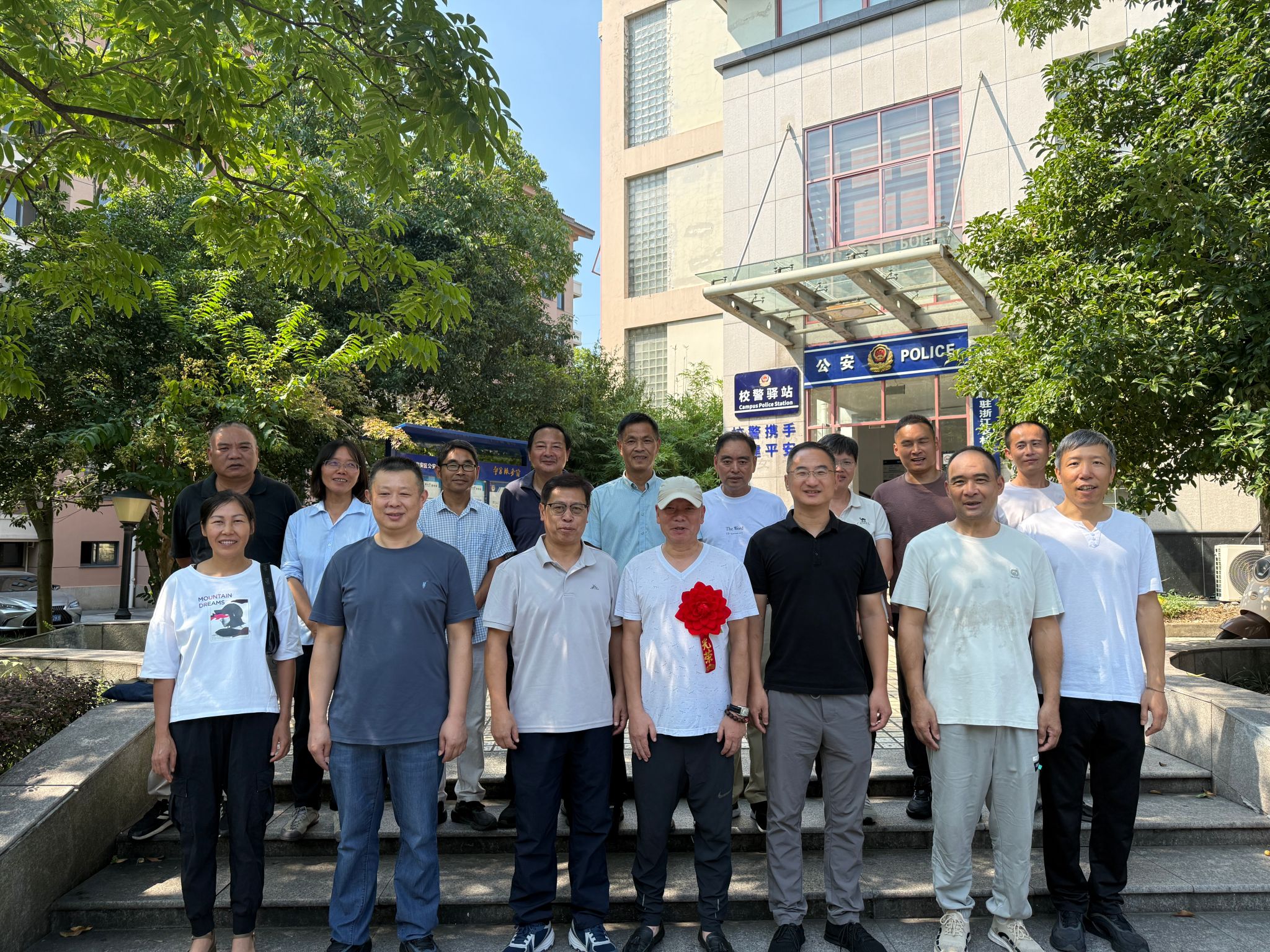 仪式上,吴青林为章文浩老师佩戴大红花,两位部长为其送上荣退纪念品,对章老师四十年如一日对校园安全的默默付出表示肯定,感谢他爱岗敬业为学校消防工作作出的重要贡献,希望他身体健康,继续关心和支持校园安保工作,有空多回来看看,与会人员纷纷送上祝福。